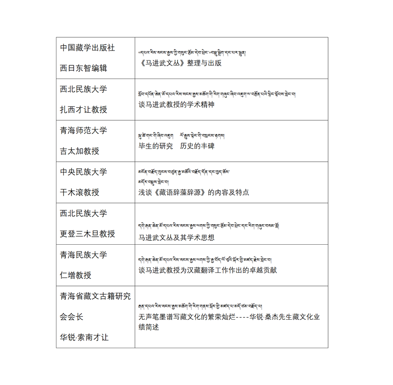 中國藏學研究中心原副總干事洛桑靈智多杰,青海省省志辦原總編、藏文古籍研究會名譽會長謝佐,西北民族大學科研處副處長英加布,甘肅省藏學研究學會副會長傅千吉,宗拉昌瓦公司總經(jīng)理扎西加等專家學者對《馬進武文叢》的學術水平和現(xiàn)實意義給予了高度評價,認為該系列叢書不僅體現(xiàn)并傳承了馬進武先生的學術思想,而且在推動新時代藏語文研究和藏漢翻譯事業(yè)發(fā)展、促進學術合作,推動民族語言學學科繁榮和進步等方面,具有高度的學術性和現(xiàn)實意義。西藏自治區(qū)藏醫(yī)院副院長銀巴研究員、四川民族出版社社長澤仁扎西、青海師范大學原副校長扎布教授、夏壩·嘉央克珠、甘肅華銳剛乃旦才讓、青海民族大學旦正教授、青海民族出版社副社長阿寧·扎西東主等對《馬進武文叢》的出版發(fā)行表示祝賀。