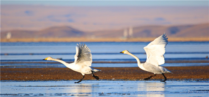冬日的青海湖,一碧千里沒(méi)有雜色。湖面像一層薄薄的透明玻璃,晶瑩剔透,湖岸周圍是金黃的草場(chǎng),遠(yuǎn)處是高聳入云的雪峰,潔白的天鵝恰似水中仙子,伸展雙翼,引翅拍水,蕩漾著水波,構(gòu)成一幅冬日美景圖。[詳細(xì)] -