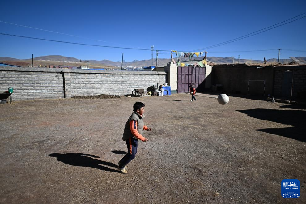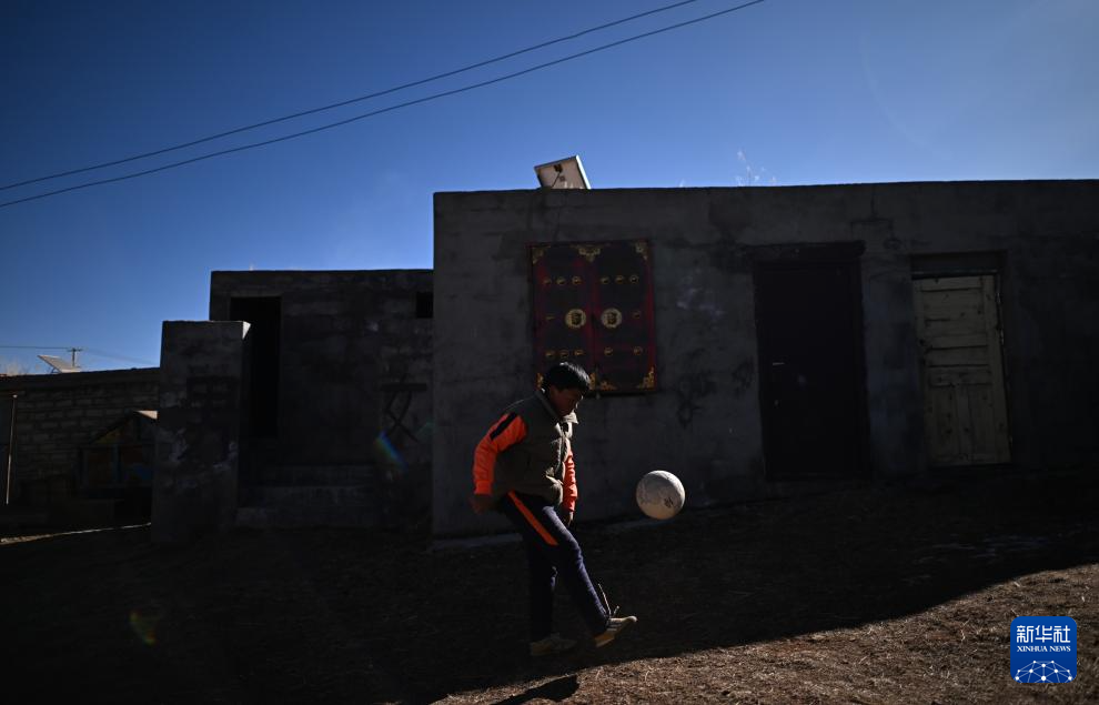 青海玉樹曲麻萊縣約改鎮(zhèn)中心寄宿制學(xué)校學(xué)生悟金唐巧多杰在家中踢球,作為曲麻萊青訓(xùn)隊一員,他即將前往廣西壯族自治區(qū)北海市參加球隊冬訓(xùn)(1月12日攝)。新華社記者 張宏祥 攝