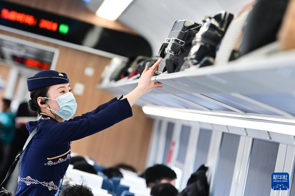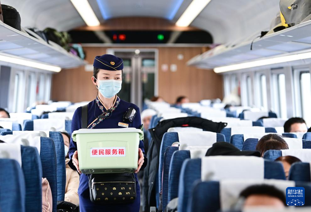 1月30日,中國鐵路青藏集團(tuán)有限公司西寧客運(yùn)段動(dòng)車隊(duì)乘務(wù)員王璐在為旅客服務(wù)。新華社記者 張龍 攝