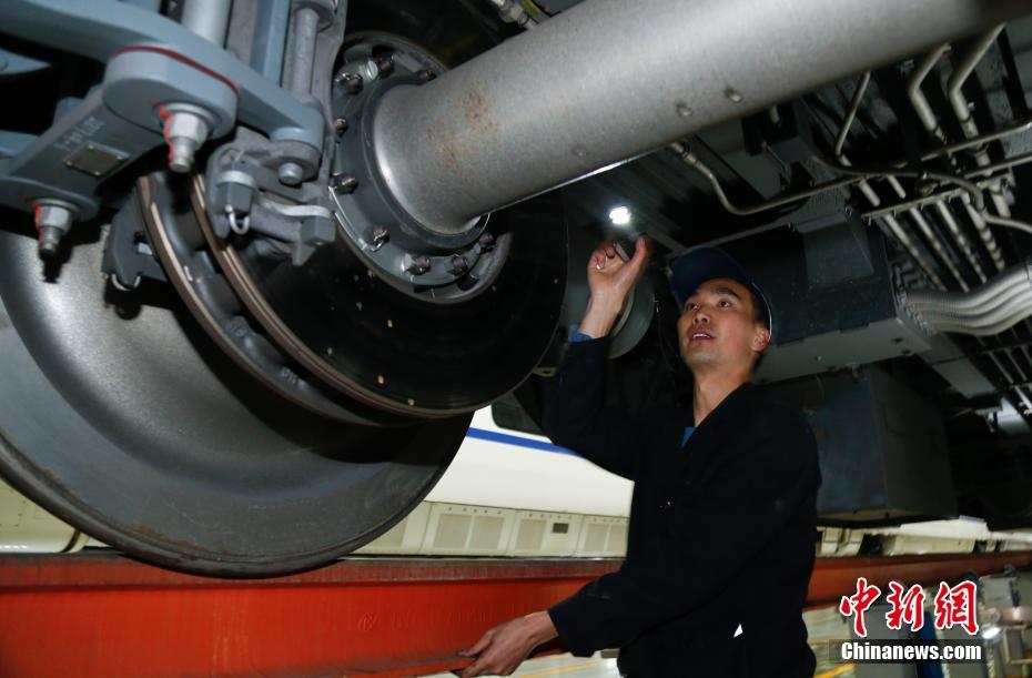 1月30日晚,在青藏鐵路公司西寧車輛段動車運用車間,地勤機械師在無電作業(yè)時進行動車組走行部關(guān)鍵部位的檢修。中新社記者 馬銘言 攝