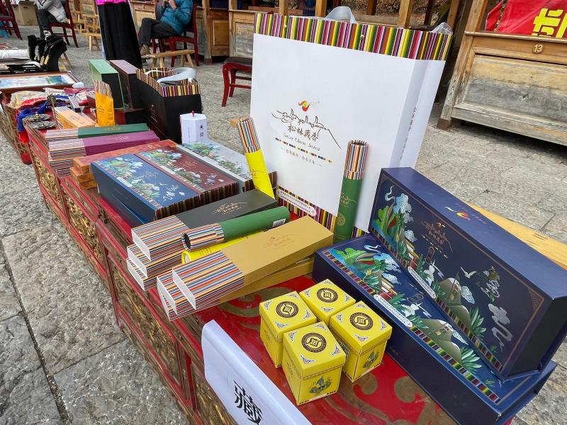 活動現(xiàn)場陳列的非遺產(chǎn)品:尼西土陶、木碗、藏香等精美展品吸引了眾多游客和市民欣賞、購買。