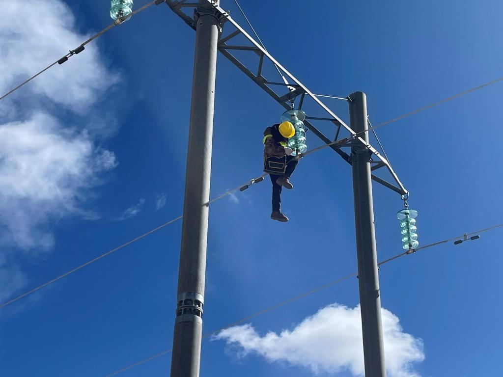 一趟列車呼嘯而過,職工們站在圍欄外靜靜地等待調(diào)度命令。沒過多久,對講機里傳來值班員彭敬成傳達的調(diào)度命令“停電命令已下達,可以接掛地線,準(zhǔn)備開始作業(yè)?!彪S著停電命令的下達,大家開始了緊張有序的集中檢修工作。