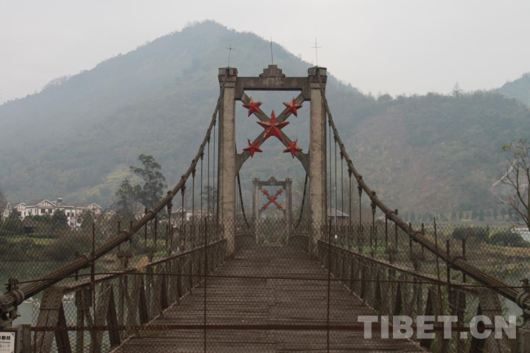 站在橋邊,遙望蜿蜒的江水就是青衣江,飛仙關(guān)橋全長(zhǎng)164米,寬4.5米,索塔為鋼筋混凝土門式框架,高29米,流動(dòng)式索鞍,策略式索錠,當(dāng)時(shí)的設(shè)計(jì)載重為15噸。橋柱橫額上有時(shí)任西南軍政委員會(huì)主席劉伯承所題寫的橋名——“飛仙關(guān)橋”。橋西岸塔柱有時(shí)任十八軍政委譚冠三題寫的檻聯(lián)——“發(fā)揮天才,發(fā)揮力量,戰(zhàn)勝困難,創(chuàng)造人民幸福,一面進(jìn)軍,一面建設(shè)解放西藏,鞏固西南國(guó)防”的字樣。東岸塔柱上有時(shí)任西康省主席廖志高題寫的檻聯(lián)——“勞動(dòng)創(chuàng)造世界飛仙天險(xiǎn)何難克服,革命帶來幸福閉塞邊區(qū)從此繁榮”字樣。橋上五顆閃閃的紅星,映照著飛仙關(guān)的繁榮,也印證著革命前輩們的美好愿景已經(jīng)變?yōu)楝F(xiàn)實(shí)。