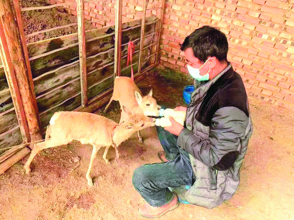 周增本給小普氏原羚喂奶。哈爾蓋鎮(zhèn)供圖