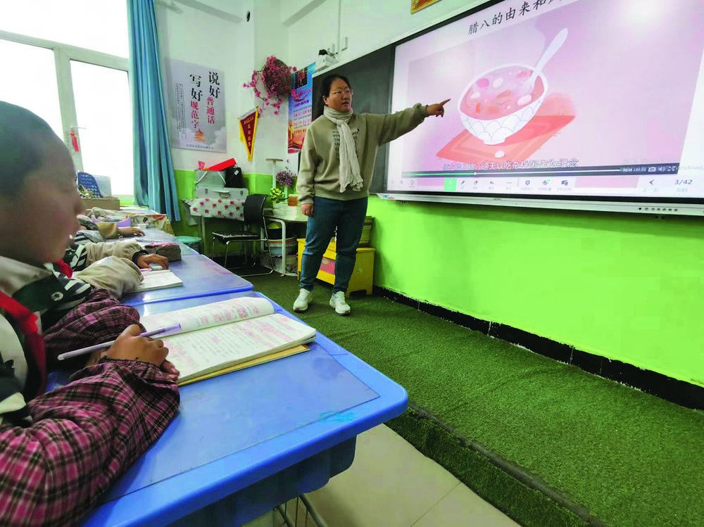 老師解萌萌借助智能黑板,通過(guò)視頻給學(xué)生講授中國(guó)傳統(tǒng)節(jié)日和文化。