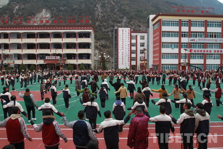 圖為學(xué)校師生們課間操跳民族鍋莊舞 攝影:登真巴珍