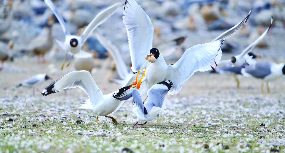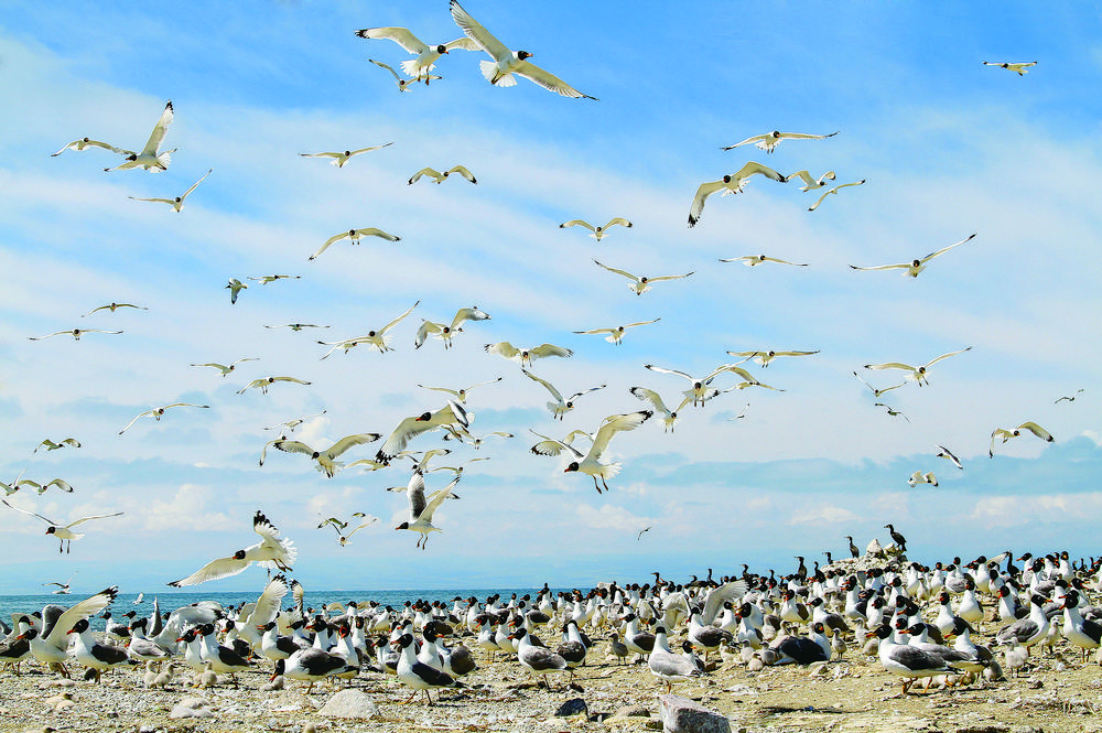 候鳥北歸,青海湖又將進(jìn)入一年中最美麗的時(shí)節(jié)。浮想盛夏時(shí)節(jié),棕頭鷗、漁鷗、斑頭雁、普通鸕鶿等水鳥,或成群在低空中擺著“隊(duì)形”,或“拖家?guī)Э凇痹谒嫔湘覒蛲嫠?,或和洄游的湟魚上演魚鷗“大戰(zhàn)”,碧波蕩漾的青海湖將美得如詩如畫。(本版圖片除署名外,其他均由青海湖景區(qū)保護(hù)利用管理局提供)