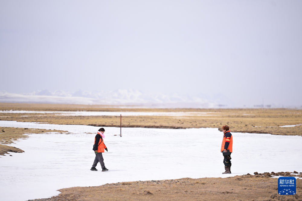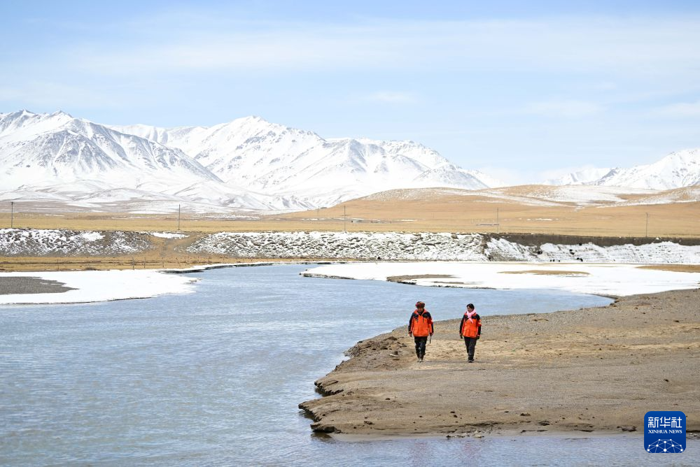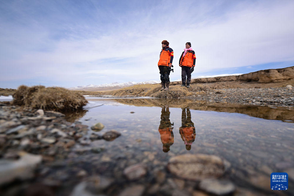 3月21日,葉金俄日(右)與東木措在青海省海北藏族自治州祁連縣的黑河流域巡護(hù)。新華社記者 張龍 攝