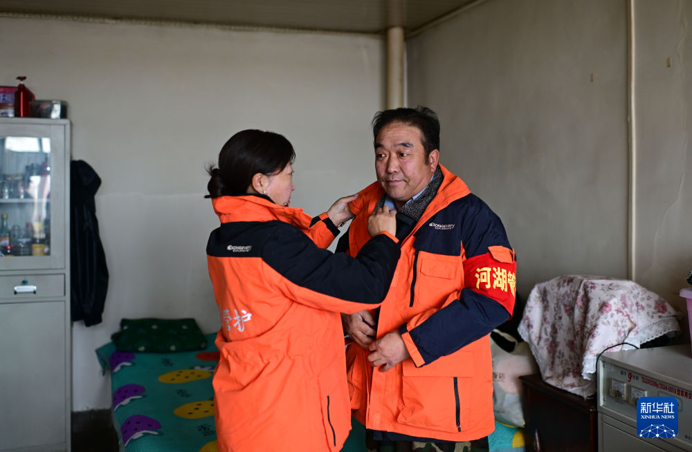 3月21日,葉金俄日(右)與妻子?xùn)|木措在巡護(hù)前整理衣服。新華社記者 耿輝凰 攝