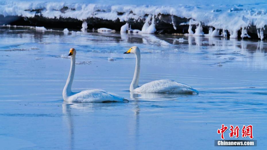 圖為天鵝在冰面上曬太陽(yáng)。巴圖那生 攝