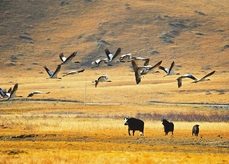 黑頸鶴是世界上唯一生長、繁衍在高原的鶴類。每年3月中下旬,在云貴高原越冬的黑頸鶴就開始陸續(xù)遷徙到紅原、若爾蓋等地繁衍生息。等到11月氣溫下降,這些黑頸鶴又將再次南遷。