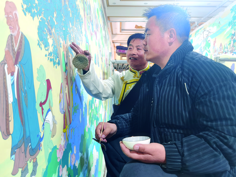 “小范,朱砂顏色有點(diǎn)厚,碗里再加點(diǎn)水,顏料稠度要合適,這樣顏料不易從畫布上剝落……”扎西尖措耐心地指導(dǎo)徒弟范慶基。每天,扎西尖措都會(huì)來畫室轉(zhuǎn)轉(zhuǎn),為徒弟指出繪畫、上色等方面的不足之處,幫助他們更快進(jìn)步。