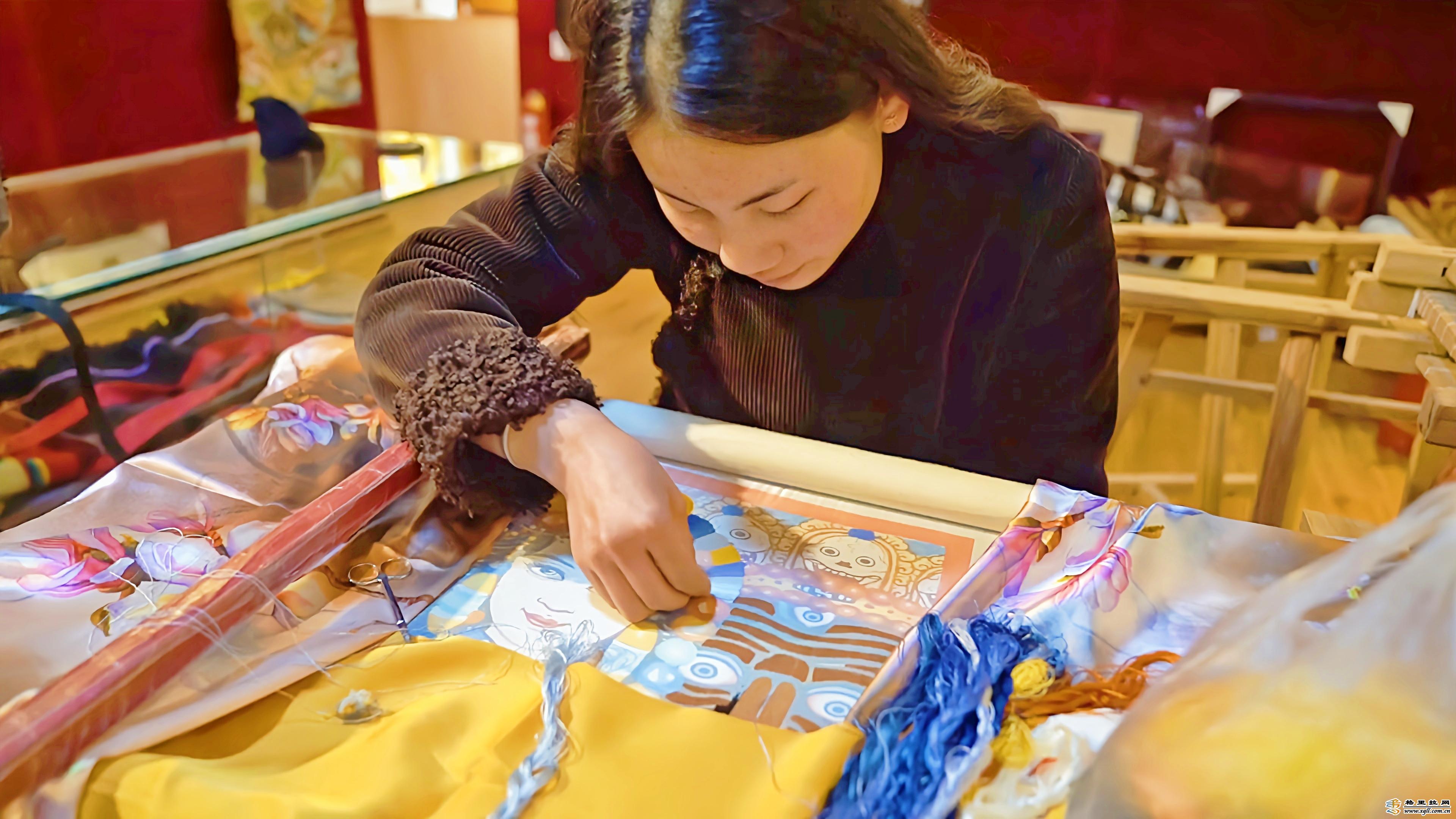 走進(jìn)位于獨(dú)克宗古城的香格里拉藏繡文化藝術(shù)院,一件件精美的手工藏繡作品陳列在展館內(nèi)。堆繡、盤金、打籽針法展示出不同風(fēng)格的藏繡手法,細(xì)韌、明亮而又富有彈性的絲線使得繡品艷麗而有光澤,吸引著南來北往的游客前來參觀。