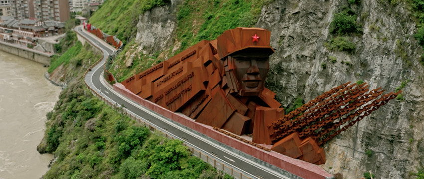 4月20日,大渡橋橫,春和景明。漫步于瀘定縣瀘橋鎮(zhèn)河?xùn)|片區(qū)的濱河廣場,對岸河西片區(qū)的海子山下,“驚險奇絕”的景觀墻映入眼簾。自南向北遠眺,入目的是巨大的耐候鋼塑紅軍主題雕像群,由主雕“勇士魂”及“飛”“奪”兩組副雕構(gòu)成敘事動線,重溫再現(xiàn)撼人心魄的恢弘歷史。