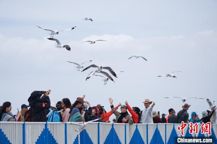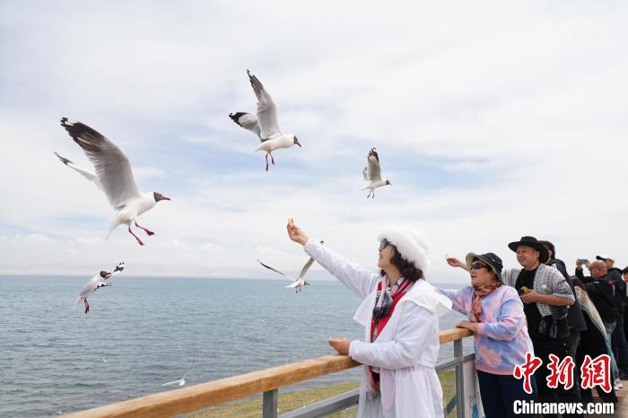 圖為游客在青海省海南藏族自治州共和縣青海湖二郎劍景區(qū)內與棕頭鷗互動。 馬銘言 攝