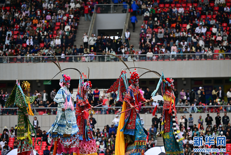 開幕式現(xiàn)場,非遺高蹺走進綠茵場。新華社記者 張龍 攝