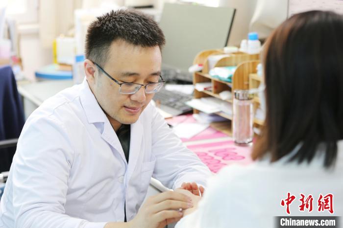 圖為上海援青醫(yī)療人才、青海省中醫(yī)院醫(yī)務(wù)科副主任張圣宏為患者把脈。張?zhí)砀?攝