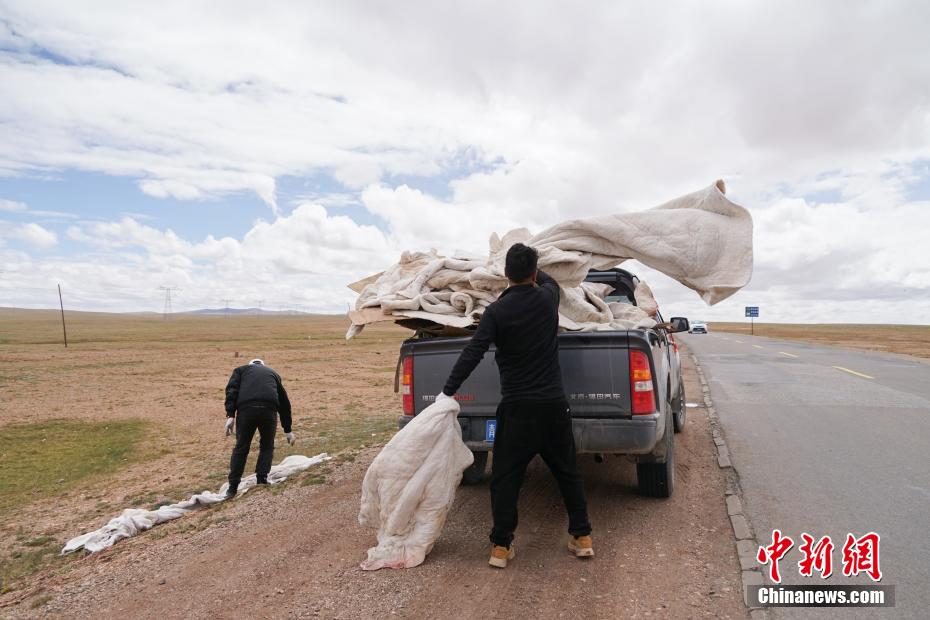 6月20日,三江源國(guó)家公園長(zhǎng)江源園區(qū)可可西里管理處五道梁保護(hù)站的2名生態(tài)管護(hù)員將青藏公路沿線垃圾撿起裝車。中新社記者 馬銘言 攝