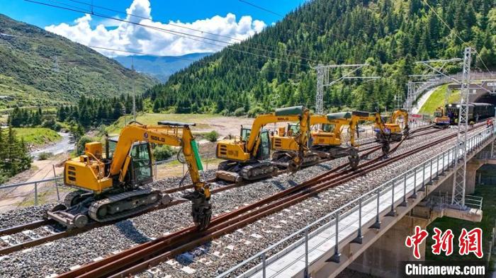 川青鐵路鎮(zhèn)黃段500米長軌鋪設(shè)采用“直鋪法”和“換鋪法”相結(jié)合的方式組織施工,無砟道床采取“直鋪法”施工,有砟道床采取“換鋪法”施工,利用工具軌鋪通右線,作為工程路料運(yùn)輸主線,同時兼顧左線鋪軌、長軌焊接鎖定及大機(jī)搗固穿插施工作業(yè)?!盀榇_保鋪軌安全有序推進(jìn),專門配置了HXN5型高原大功率內(nèi)燃機(jī)車等80余臺(輛)大型設(shè)備開展軌道施工作業(yè)。”張華稱,期間項(xiàng)目部合理分配資源,5天完成100公里長鋼軌鋪設(shè),12天完成100公里無縫線路單元焊接及放散鎖定工作。