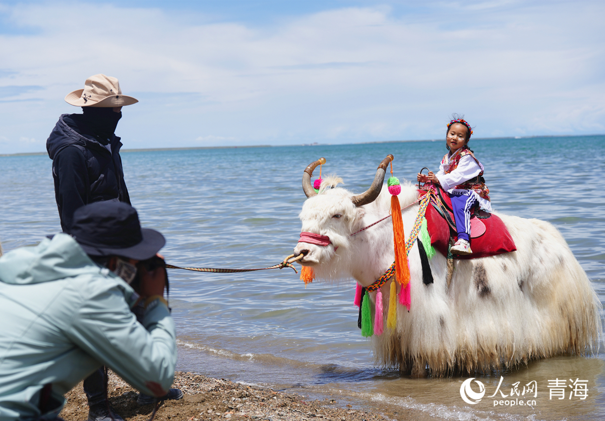 上班時(shí)間到,尕瑪本牽著白牦牛來到了青海湖景區(qū)的西湖灘,與其他村民家的二三十頭白牦牛排排站立在湖邊,靜待游客前來觀賞、騎行、拍照。