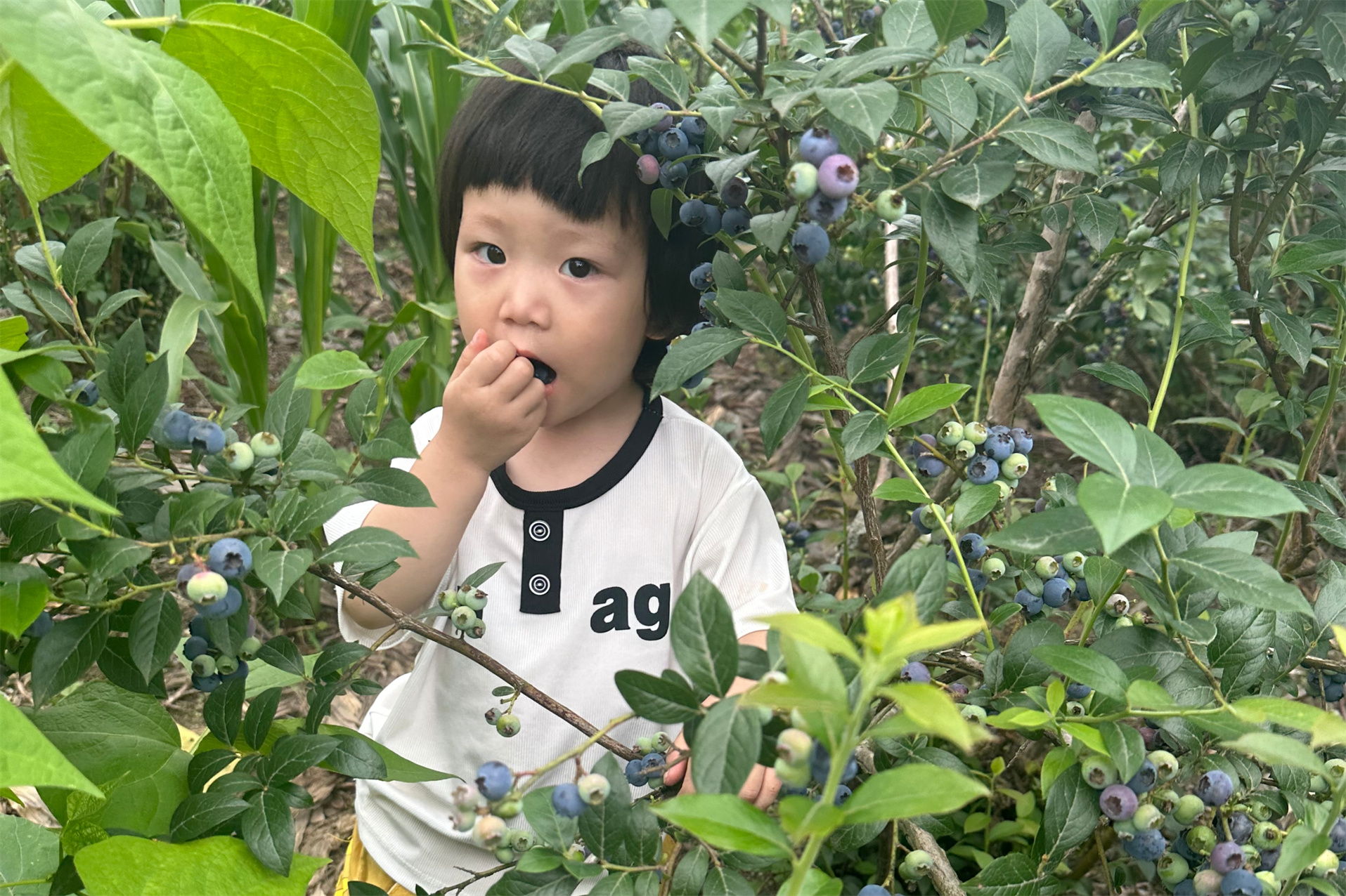 小朋友正在體驗(yàn)藍(lán)莓采摘。