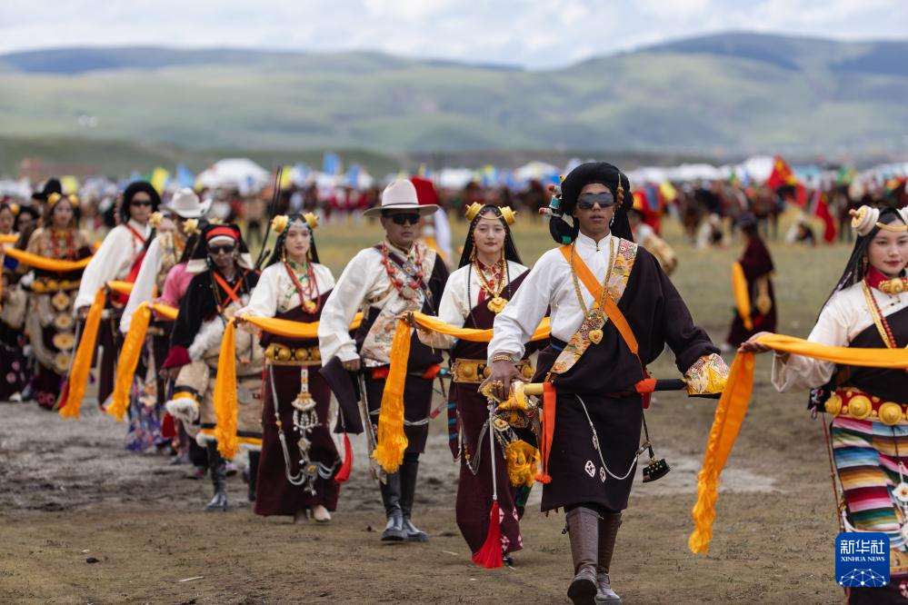 7月30日,在理塘縣多旺塘賽馬場(chǎng),來(lái)自理塘縣高城鎮(zhèn)的方隊(duì)展示傳統(tǒng)民族服飾。新華社記者 江宏景 攝
