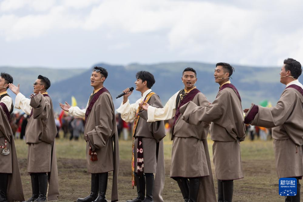 7月30日,在理塘縣多旺塘賽馬場(chǎng),來(lái)自理塘縣的丁真珍珠與其他本土歌手演唱歌曲。新華社記者 江宏景 攝