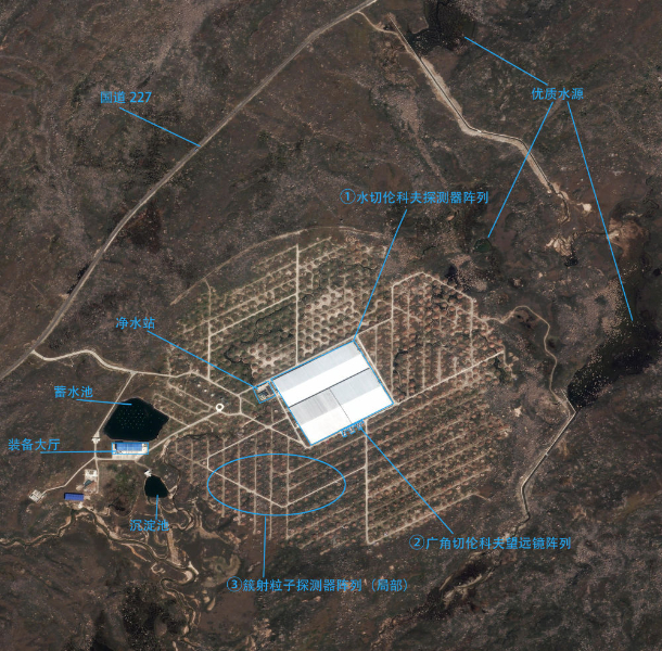 從衛(wèi)星影像示意圖上可以看到,“拉索”毗鄰國(guó)道,地勢(shì)整體平坦,優(yōu)質(zhì)水源豐富。得益于世界屋脊的高海拔優(yōu)勢(shì)和多項(xiàng)關(guān)鍵核心技術(shù)的突破,“拉索”集合了三項(xiàng)“世界之最”:最靈敏的超高能伽馬射線探測(cè)裝置,最靈敏的甚高能伽馬射線源巡天普查望遠(yuǎn)鏡,能量覆蓋范圍最寬的超高能宇宙線復(fù)合式立體測(cè)量系統(tǒng)。自2021年“拉索”完成建設(shè)投入使用以來(lái),成績(jī)斐然。