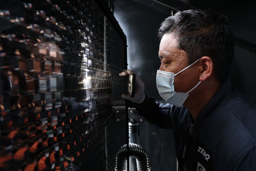 2023年4月21日,工作人員在水切倫科夫探測(cè)器陣列三號(hào)水池里更換實(shí)驗(yàn)設(shè)備。新華社記者 金立旺 攝