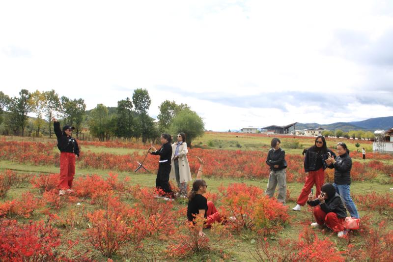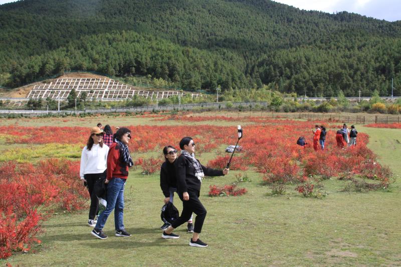 連日來,香格里拉迎來狼毒最佳觀賞期,眾多國內(nèi)外游客被草原上一片片火紅的狼毒所吸引,紛紛駐足觀賞。圖為游客在香格里拉市小中甸草原賞狼毒、拍照留影。