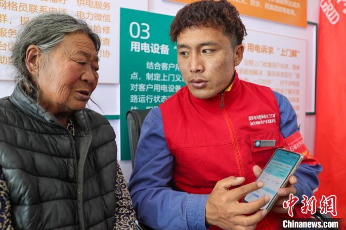 10月17日,在青海省海北藏族自治州剛察縣果洛藏貢麻村,久邁多杰為牧民介紹電力宣傳手冊。中新社記者 薛蒂 攝