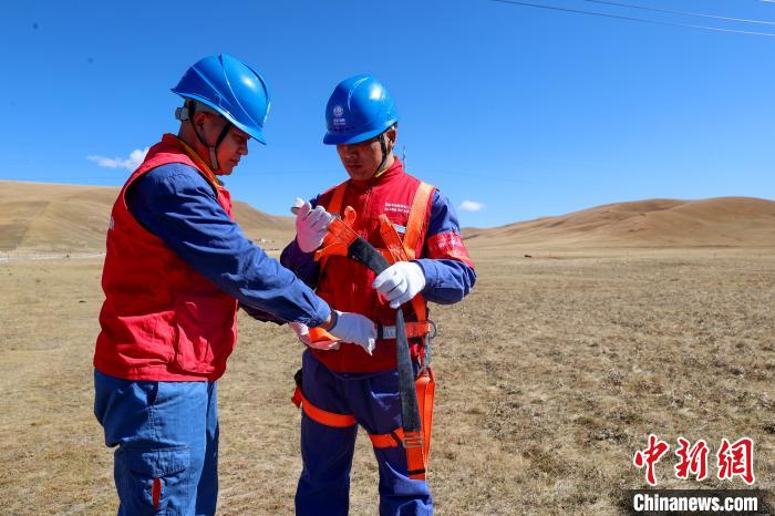 10月17日,在青海省海北藏族自治州剛察縣果洛藏貢麻村,同事為久邁多杰檢查安全防護裝備。中新社記者 薛蒂 攝