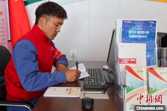10月17日,在青海省海北藏族自治州剛察縣果洛藏貢麻村,久邁多杰在電力驛站登記便民服務(wù)記錄。中新社記者 薛蒂 攝