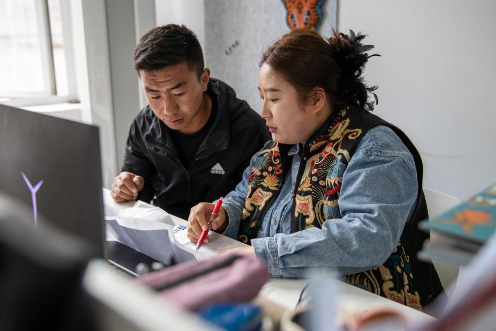 在四川省甘孜藏族自治州巴塘縣,劉莎莎在巴塘縣社會力量發(fā)展中心集群內(nèi)的辦公室與同事討論工作(11月5日攝)。