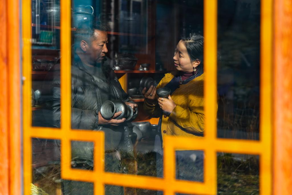 在德格縣麥宿鎮(zhèn)的扎堪倉黑陶工坊,達(dá)瓦卓瑪(右)向工坊主理人降擁格乃了解工坊近期的經(jīng)營情況以及新品研制進(jìn)展(11月4日攝)。達(dá)瓦卓瑪經(jīng)常會與麥宿鎮(zhèn)的其他手工藝者交流經(jīng)營中遇到的問題,想辦法幫他們解決。