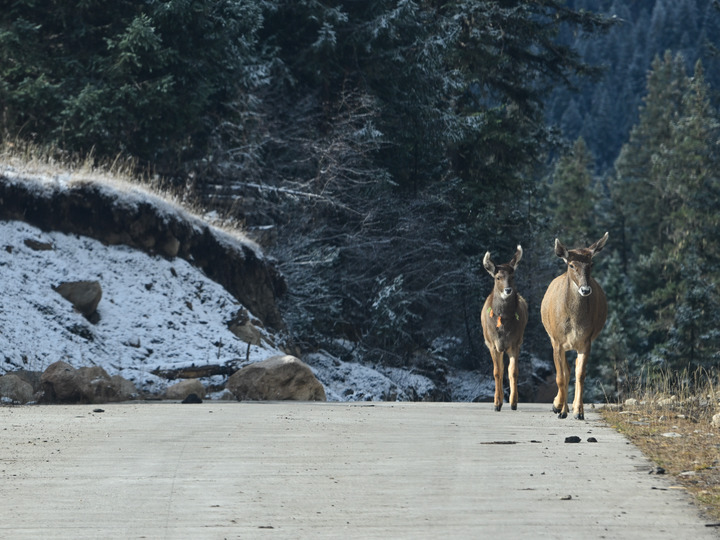 這是11月4日在甘孜藏族自治州德格縣多瀑溝景區(qū)拍攝的2只國家一級保護動物白唇鹿。新華社記者 王曦 攝