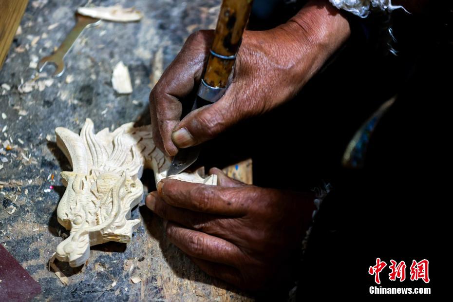 12月21日,四川巴塘,在弦胡制作坊里,王扎西雕刻琴頭。中新社記者 薛蒂 攝