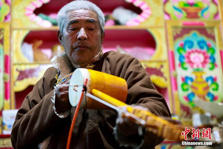 12月21日,四川巴塘,王扎西(右)在自家院中彈奏弦胡。中新社記者 薛蒂 攝