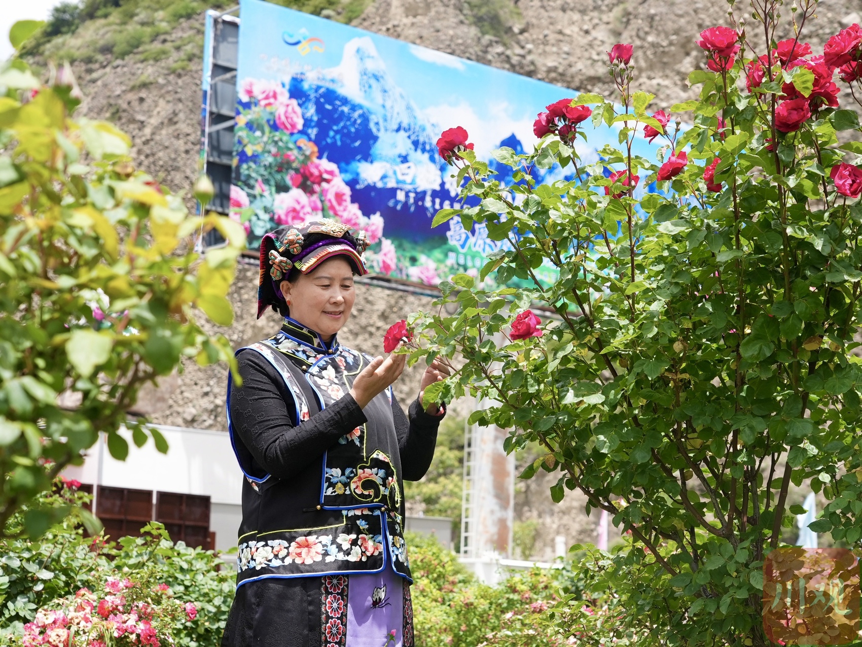 小金縣達(dá)維鎮(zhèn)冒水村黨支部書記陳望慧在玫瑰生產(chǎn)基地內(nèi)欣賞玫瑰花。