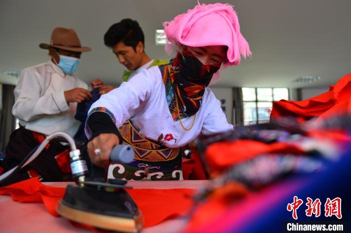 西藏山南森布日極高海拔地區(qū)生態(tài)搬遷安置點的牧民正縫制紅領(lǐng)巾。江飛波 攝
