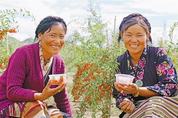 圖為當(dāng)?shù)厝罕娬谡故驹谌湛t市白朗縣嘎東鎮(zhèn)枸杞產(chǎn)業(yè)園區(qū)配套水保綜合項目內(nèi)收獲的枸杞。