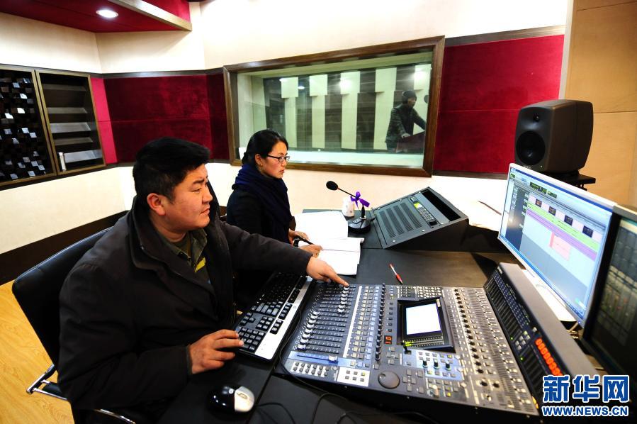 在中國(guó)西藏廣播電影電視藏語節(jié)目譯制中心,工作人員正在為影片《催眠大師》進(jìn)行藏語配音(2015年12月11日攝)。新華社記者晉美多吉 攝