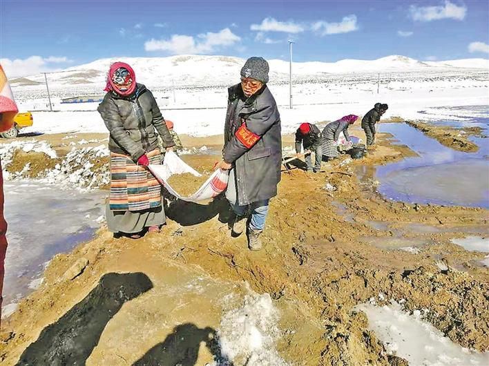 駐村期間,羅布頓珠(左二)同村民一起對嚴(yán)重影響農(nóng)牧民生產(chǎn)生活的滲水口進(jìn)行了堵截。 中國電信西藏公司供圖