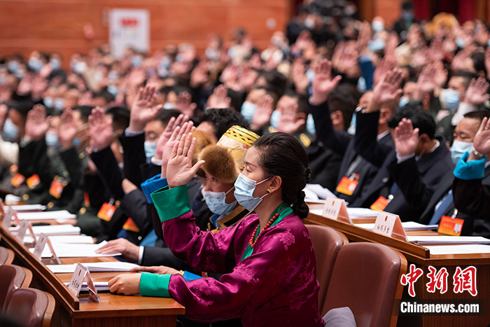 1月24日,西藏自治區(qū)第十一屆人民代表大會第四次會議上代表們舉手表決《西藏自治區(qū)國家生態(tài)文明高地建設條例(草案)》。中新社記者 何蓬磊 攝