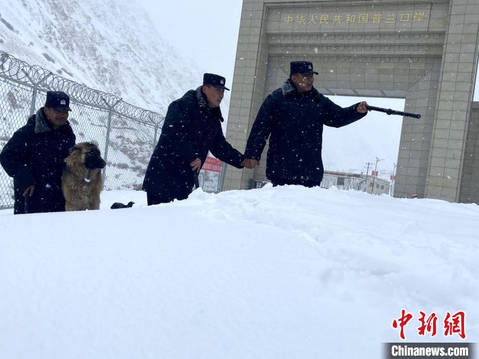 圖為在積雪中守衛(wèi)國(guó)門(mén)的普蘭邊檢站民警?!∑仗m邊檢站供圖