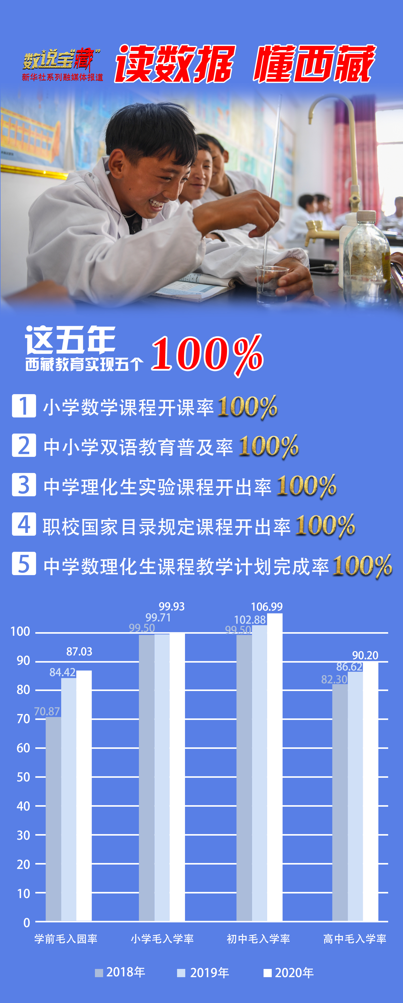 西藏自治區(qū)教育廳公布的數據顯示:“十三五”時期,西藏教育“五個100%”全面實現,即中小學雙語教育普及率100%,小學數學課程開課率100%,中學數理化生課程教學計劃完成率100%,中學理化生實驗課程開出率100%,職業(yè)技術學校國家目錄規(guī)定課程開出率100%。