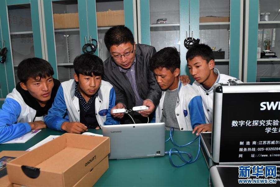 在西藏日喀則市第一高級中學,來自山東省煙臺市海陽四中的物理老師魯旭(中)在指導高三學生進行物理課分組實驗(2017年8月23日攝)。新華社記者 張汝鋒 攝