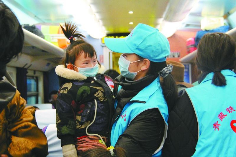 圖為拉薩火車站的志愿者在列車上為小旅客服務。