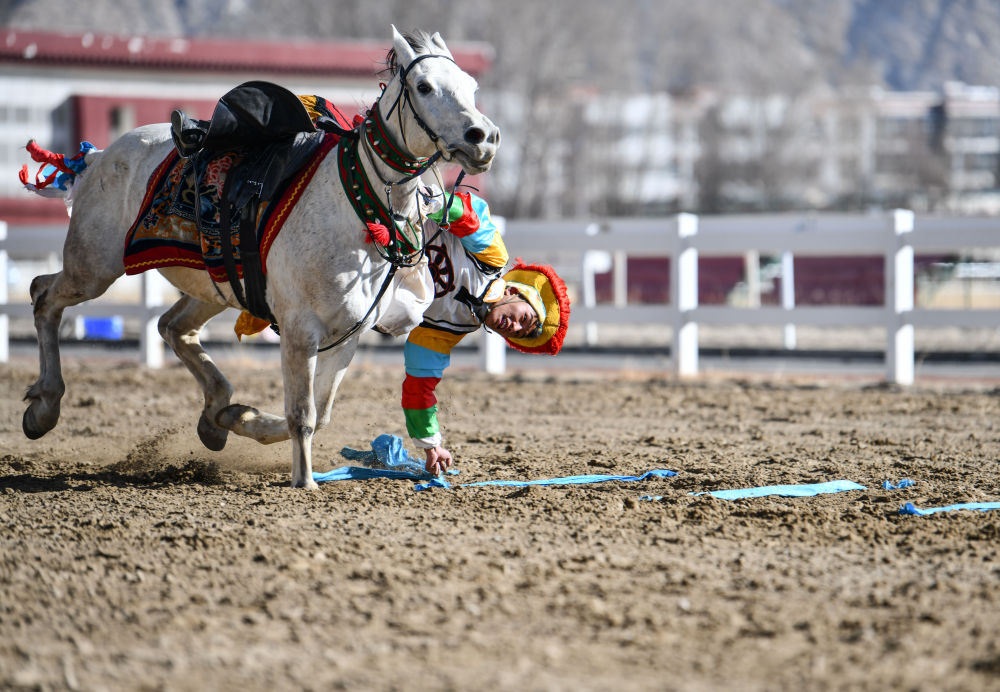 一名騎手在進行馬上撿哈達表演。新華社記者晉美多吉攝